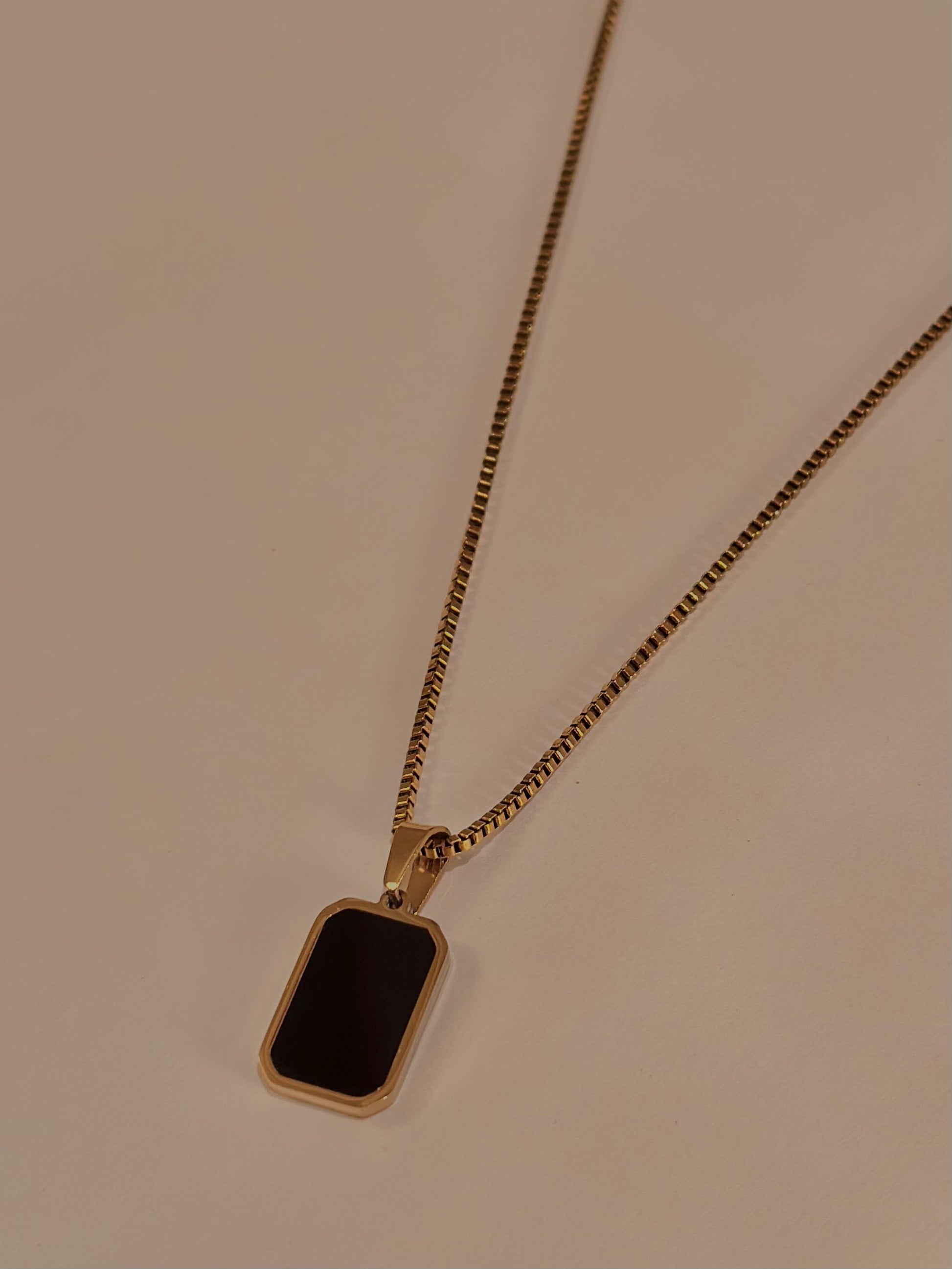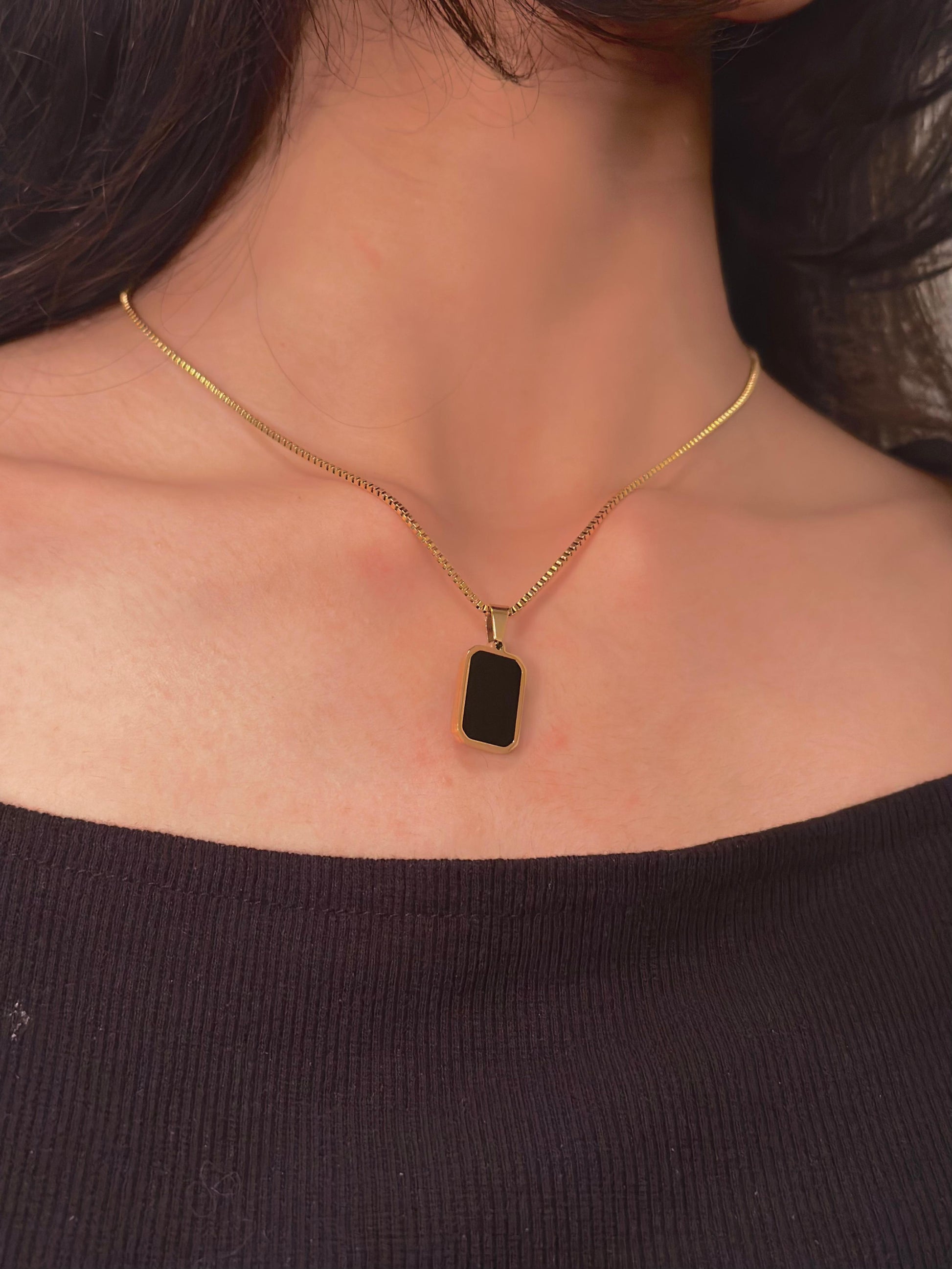 A refined expression of modern luxury. The Aura Necklace features a sleek rectangular, reversible pendant—radiant mother-of-pearl on one side and deep onyx black on the other—set in a polished gold-tone frame for effortless elegance.
