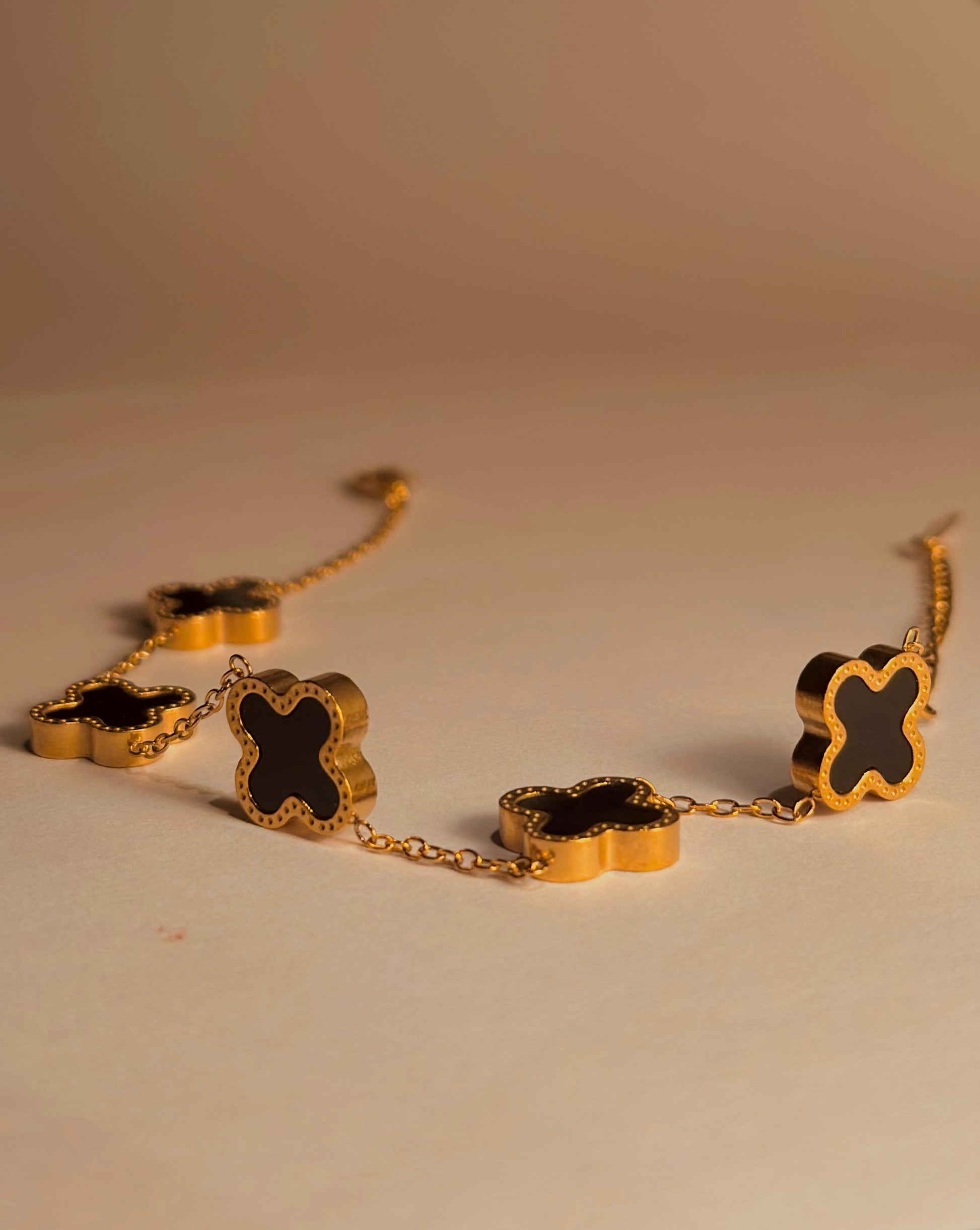 Refined, graceful, and effortlessly elegant — the Black Clover Bracelet is a true symbol of timeless luxury 💎. Crafted with a delicate gold-toned chain, this exquisite piece features five polished black clover motifs, each framed in a finely textured gold bezel that reflects light with subtle brilliance ✨.