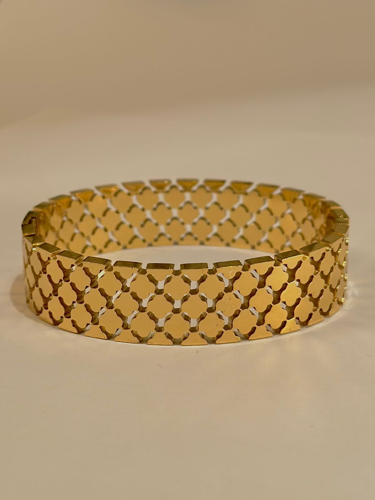 An icon of modern refinement, the Nola Cuff showcases an intricate geometric pattern sculpted into a wide, polished gold-tone band. Its architectural design reflects light with every movement, creating a statement that feels powerful, poised, and undeniably luxurious.